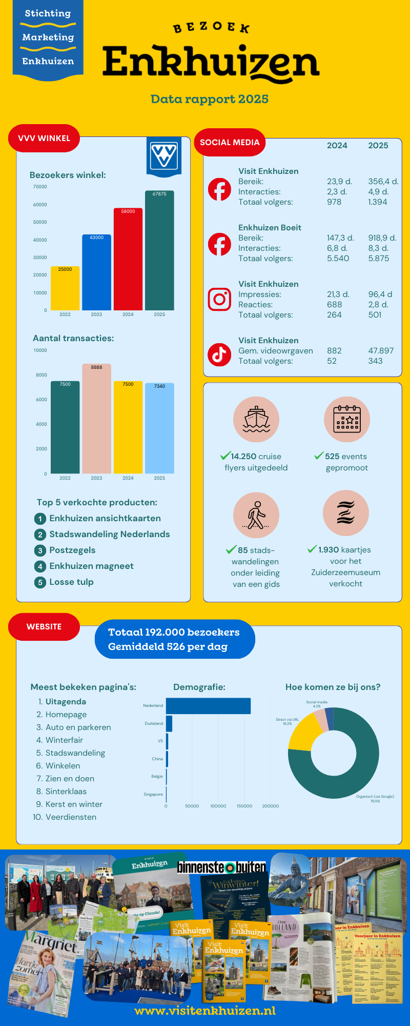 Cijfers over o.a. bezoekersaantallen van VVV Enkhuizen, de website Visitenkhuizen, de socials media kanalen en verspreid drukwerk.